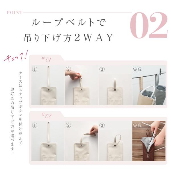 【吊り下げ方2WAY】ケース両面のスナップボタンを付け替えてお好みの吊り下げ方が選べます。