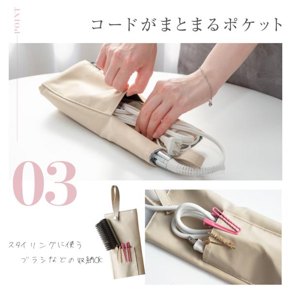 【コードがまとまるポケット】電源コードは背面のオープンポットに収納できます。余裕のあるサイズ感で面倒なバンド留めの必要なし。スタイリングに使うブラシなどの収納Ok!一般的なヘアアイロンはもちろん、小さなコテも収納可能。