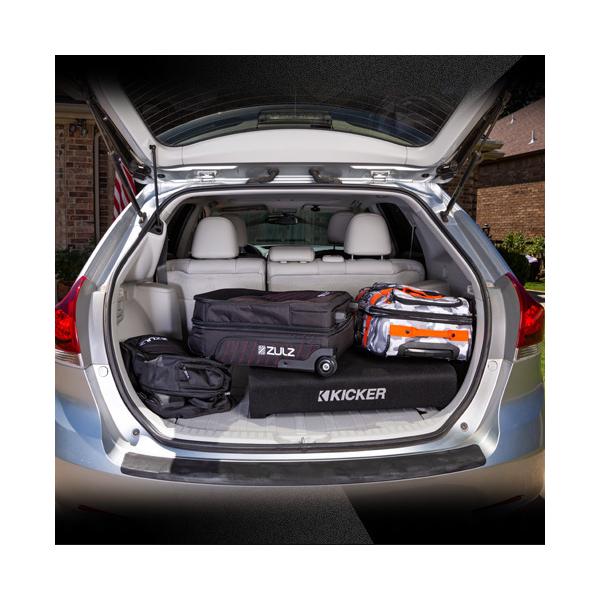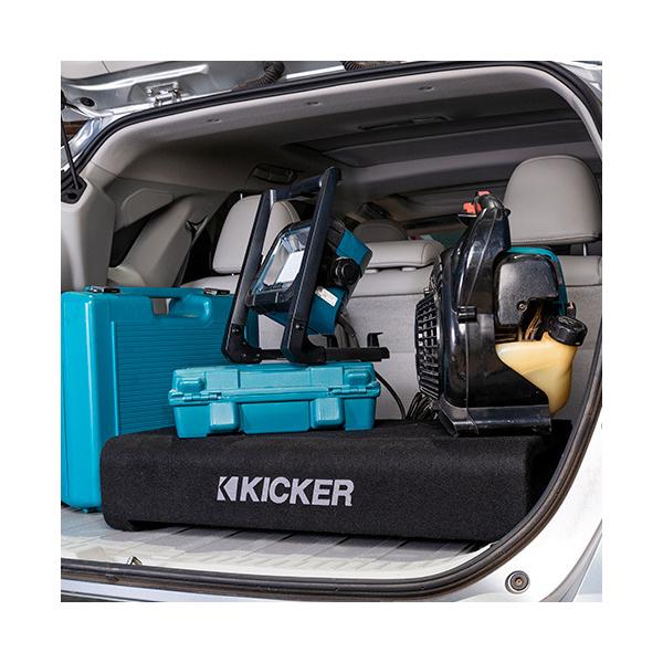 TRTPウーハーBOXは、KICKER CompRTウーハーと同サイズのReFLEX™パッシブウーファーを搭載することでサイズ以上の低音を実現します。 ウーハーの配置を下向きにしても従来通りの低音を再生し、薄いBOXの上には荷物が載せられ、貨物スペースの邪魔にもなりません。