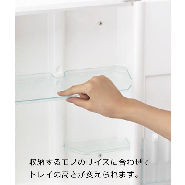 様々な洗面小物が収納できるトレイ(大・小)と扉ポケット(取り外し可能)付き。