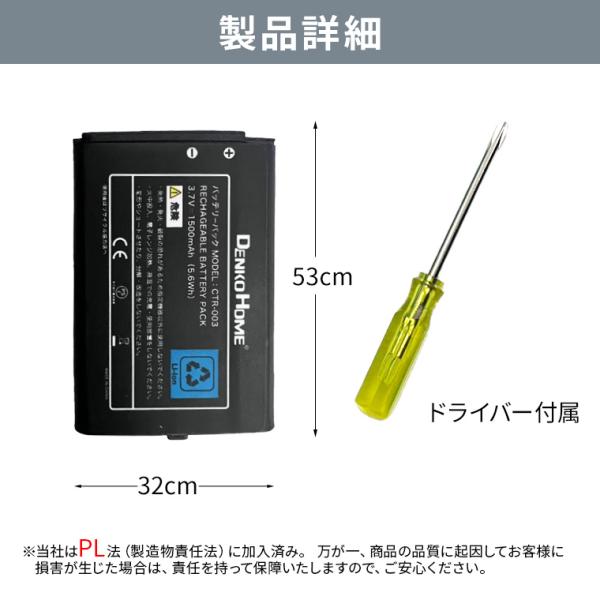 任天堂対応 ニンテンドー2DS 3DS バッテリー CTR-003 互換 PSE 認証済 1500mAh 充電バッテリー Nintendo ニンテンドー 互換電池 交換 充電池 工具付