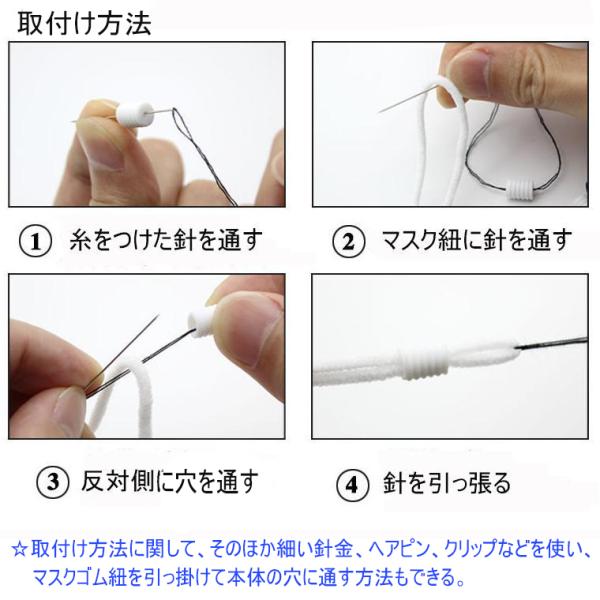 糸に付いた針または細い針金、ヘアピン、クリップなどを使い、マスクのゴム紐に引っ掛けて本体の穴に通ればOKです。