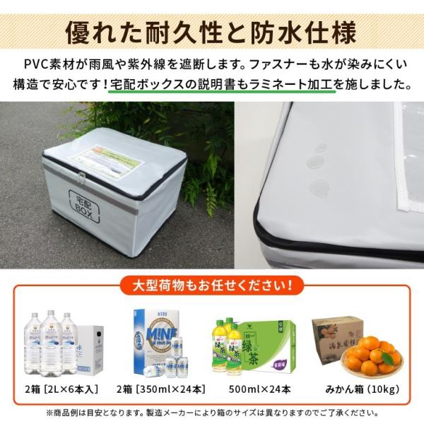 商品内容:宅配ボックス×1、ワイヤー×1、南京錠×2セット、設置/使用方法説明書×1、宅配業者様向け説明書×1