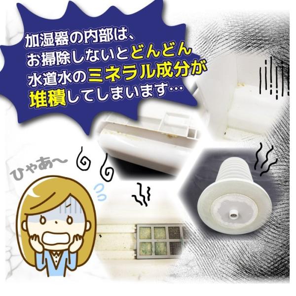 加湿器の給水トレーや、内部部品のカルキ汚れを除去。