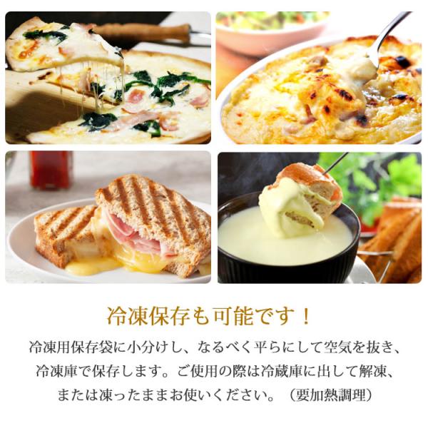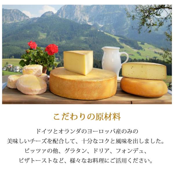 ドイツとオランダのヨーロッパ産のみの美味しいチーズを配合して十分なコクと風味を出しました。ピッツァの他、グラタン、ドリア、フォンデュ、ピザトーストなど、様々なお料理にご活用ください。