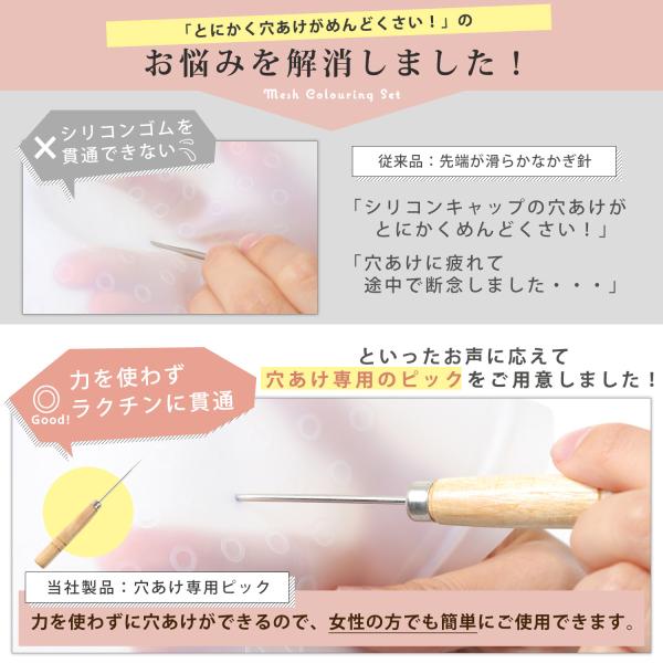 シリコン製 メッシュキャップ の“穴あけ専用ピック”をご用意しました。「穴あけ作業が難しくてめんどくさい!」のお悩みを解消しました。