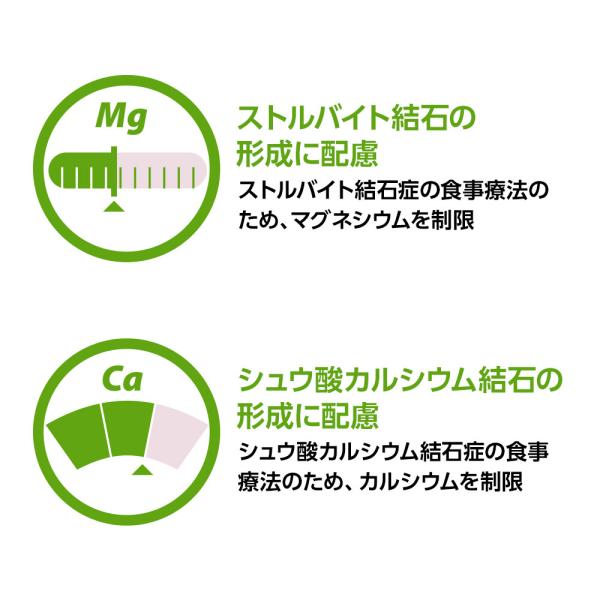 この食事は、ストルバイト結石、シュウ酸カルシウム結石が形成されにくくするために、マグネシウムやカルシウムなどのミネラル成分を調整し、さらにカロリーを抑えて肥満に配慮しています。