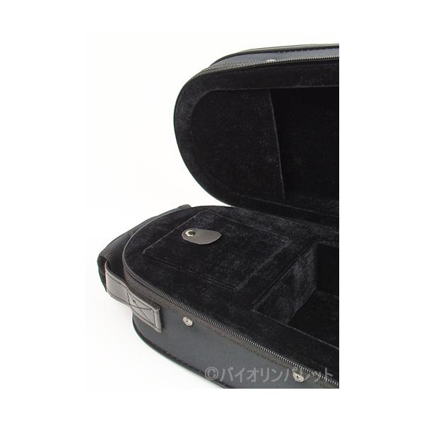 発泡素材によりなんと重量がたったの約1.2kgとたいへん軽く、内装色はブラック、蓋側のあご当て部押さえクッションによりバイオリンを優しく保持します。