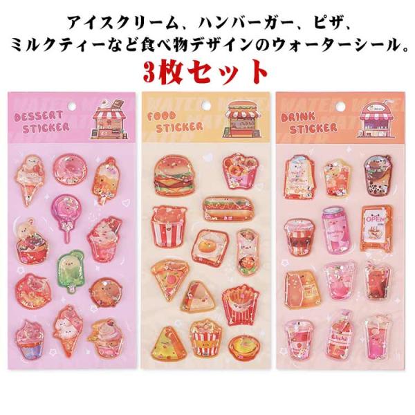 3枚入り 水入りシール 食べ物 ウォーターシール 飲み物 ドーナツ 女の子 立体シール ウォーターインシール ケーキ シール帳 デコシール ぷくぷくシ