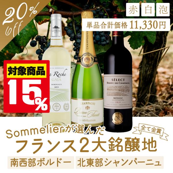 対象P15% すべてフランス金賞 銘醸地づくし ワイン ワインセット シャンパン入り ソムリエ厳選 福袋 赤 白 泡 3本セット 辛口 ソムリエセット 送料無料 爆買