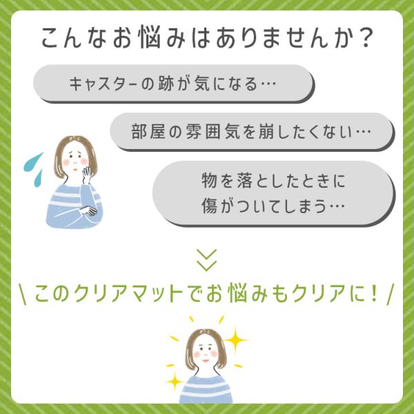フローリングに敷くだけで、テーブルの足や椅子のタイヤによる床へのダメージを軽減します。