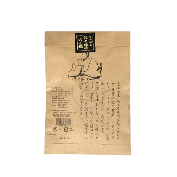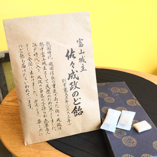 ◆その昔、富山の薬売りが和漢薬と一緒に届けたという言い伝えがある「富山城主 佐々成政のど飴」