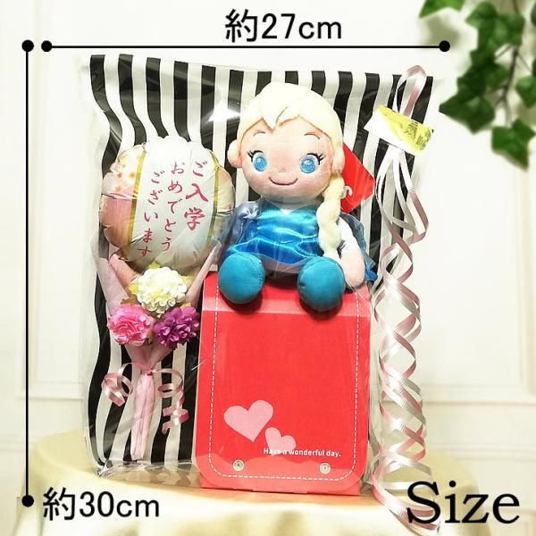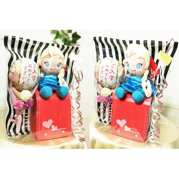 ディズニープリンセスのぬいぐるみとビスコ入ランドセルと花束付ミニバルーンをおしゃれにラッピング☆