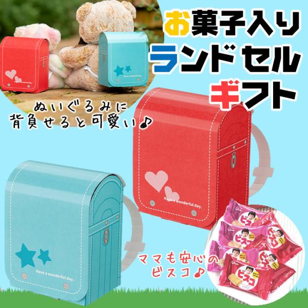 「お菓子(ビスコ)入りランドセルギフト(桜柄の赤か青、ハート柄の赤、星柄の水色から選択)」