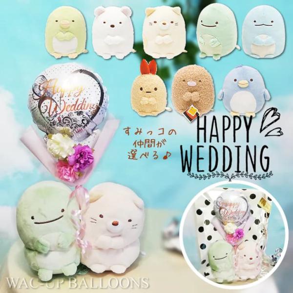 すみっコぐらし カップル 結婚式 バルーン電報 ブーケ ねこ とかげ ぺんぎん ぬいぐるみ 結婚祝ウェディングレース ミニバルーン花束付すみっコぐらしSペア