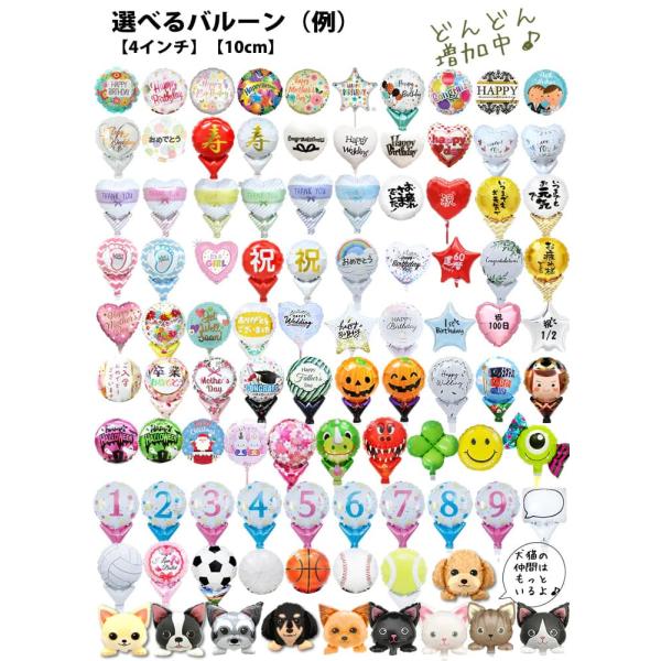 パソコンからは、このページ下、スマホからは、「商品情報をもっと見る」をクリックして、「選択バルーン一覧」の画像リンクをクリックして一覧のページからお好きなバルーンを選んで、本商品と一緒に注文して下さい。