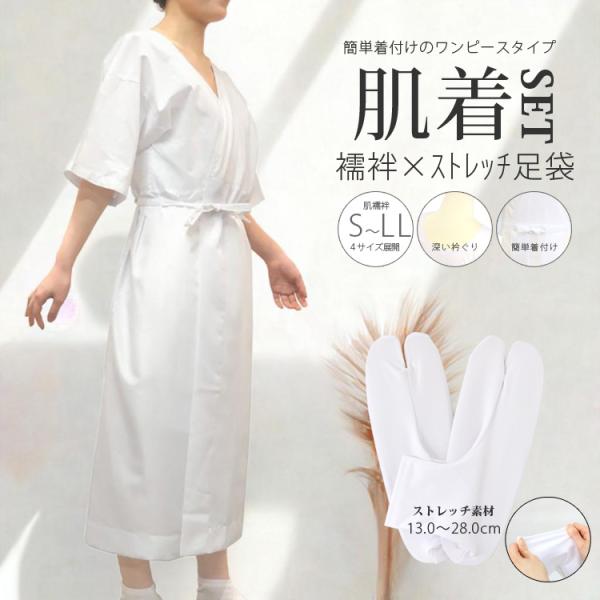肌着 足袋 2点セット ストレッチ足袋 着物 浴衣 通年 肌襦袢 袖あり スリップ ワンピース ゆかた下 ゆかた用 S M L LL 13.0-28.0cm レディース 和装インナー 綿