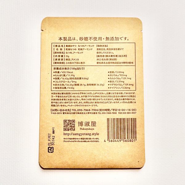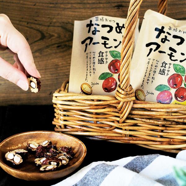 なつめの種を抜き、アーモンドを入れて分厚くスライスしました。鉄分、カリウム、ビタミンB類など美容や健康に欠かせない栄養素がたっぷり入っています。素材の甘みを感じる優しい味で、お子様や妊婦さんにも安心してお召し上がりいただけます。