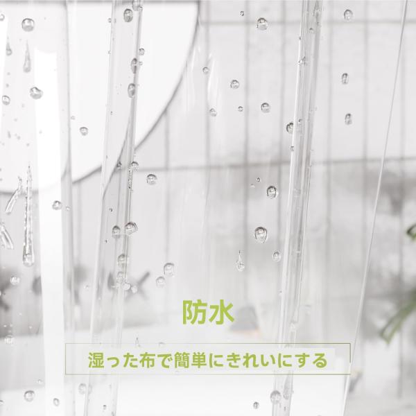 シンプルで透明なビニールカーテンは、シャワーカーテンとしてだけではなく、エアコン効率UP&省エネ対策の間仕切りやのれん、ウイルス対策の飛沫防止用の間仕切り、レジカウンターなどにも適切。ポールに引っかけるだけで、簡単に取り付けできるので浴室、洗面所、トイレ、キッチン、職場更衣室、車庫、暖房室、冷房室などさまざまなシーンで使用可能です。