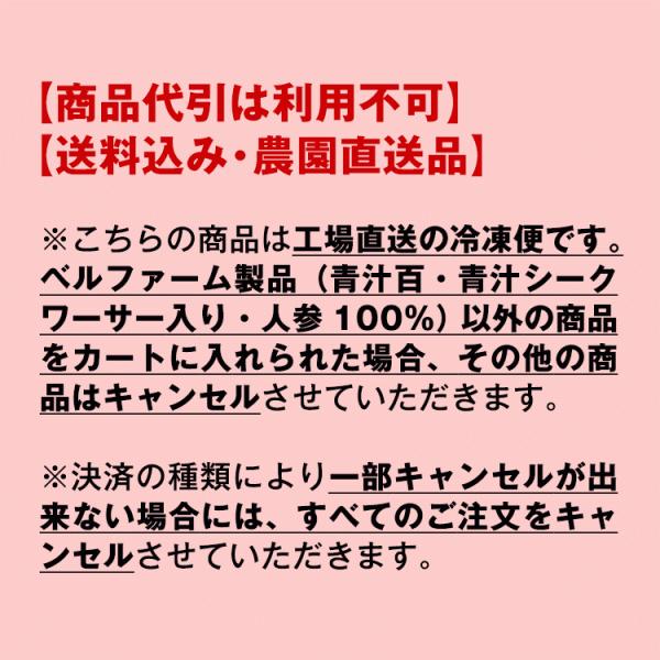 ※こちらの商品は工場直送の冷凍便です。ベルファーム製品(青汁百・青汁シークワーサー入り・人参100%)以外の商品をカートに入れられた場合、その他の商品はキャンセルさせていただきます。