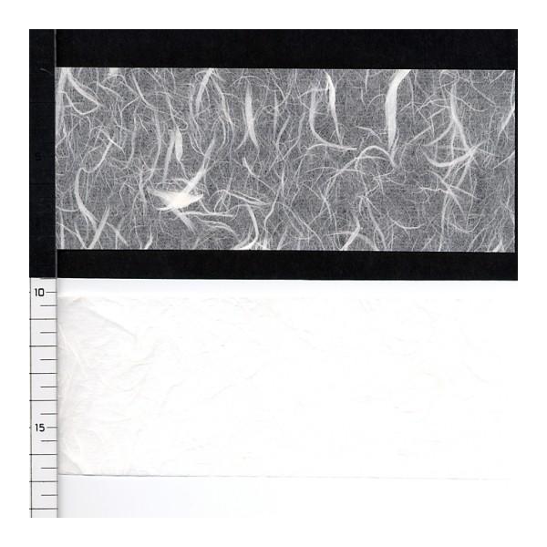 機械漉き・原料は楮(こうぞ)100%です。サイズ:約菊判(939mm×636mm) 短辺(636mm)2辺は漉きっぱなしの耳付きです。厚さ(重さ):約3.5匁(13g強) 着色した楮(こうぞ)の長い繊維を混ぜて漉きました。長い繊維がさまざまの方向にくねって装飾となっています。