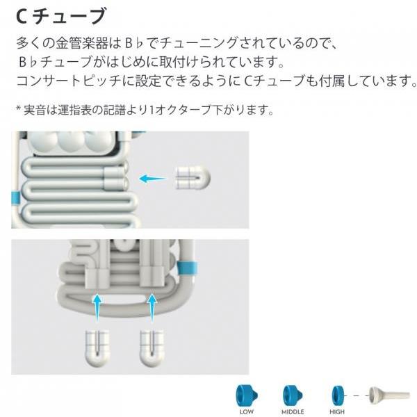 バリトンホーン ユーフォニアム トロンボーンと同じ音域。形や構えはユーフォっぽい。フレンチホルンよりもアルトホルン寄り。チューニングはB♭ですがC調にできる管付き。耐久性のある ABS樹脂で音色は大きくて表現力があり。マウスピースにゴムのようなプニプニしたシリコンラバーを付けるので感触が独特。初心者には吹きやすいかと。1つのマッピに対し深さを選べる3種類のシリコンラバーがあり1つでは若干音域の変化が難しい。アルトホルンのマッピと互換性あり。特許取得済みのロータリーフェイスバルブ。演奏後は水洗いしよく乾かすこと。■NUVO jHORN N610JH ヌーボ Jホーン ジェイホーン■楽器■調子 B♭調/C調■管体素材 プラスチック■ベル胴輪/ウォーターキー/ステムカバー:シリコンラバー■完全防水仕様■音域 E2〜B♭4■カラーライナップ:N610JHWBL ホワイト+ブルー,N610JHWPK ホワイト+ピンク,N610JHWGR ホワイト+グリーン,N610JHBBK ブラック+ブラック■本体重量 約667g■本体全長 約36cm■管長 約250cm■セット内容:本体,セミハードケース,ケース用ショルダーストラップ,説明書/運指表,マウスピース3種類(LOW/MIDDLE/HIGH),Oリング用グリス
