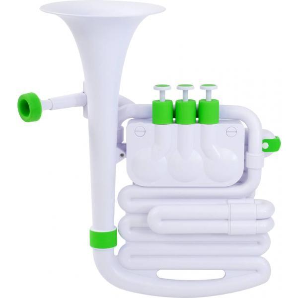 バリトンホーン ユーフォニアム トロンボーンと同じ音域。形や構えはユーフォっぽい。フレンチホルンよりもアルトホルン寄り。チューニングはB♭ですがC調にできる管付き。耐久性のある ABS樹脂で音色は大きくて表現力があり。マウスピースにゴムのようなプニプニしたシリコンラバーを付けるので感触が独特。初心者には吹きやすいかと。1つのマッピに対し深さを選べる3種類のシリコンラバーがあり1つでは若干音域の変化が難しい。特許取得済みのロータリーフェイスバルブ。演奏後は水洗いしよく乾かすこと。■NUVO jHORN N610JH ヌーボ Jホーン ジェイホーン■楽器■調子 B♭調/C調■管体素材 プラスチック■ベル胴輪/ウォーターキー/ステムカバー:シリコンラバー■完全防水仕様■音域 E2〜B♭4■カラーライナップ:N610JHWBL ホワイト+ブルー,N610JHWPK ホワイト+ピンク,N610JHWGR ホワイト+グリーン,N610JHBBK ブラック+ブラック■本体重量 約667g■本体全長 約36cm■管長 約250cm■セット内容:本体,セミハードケース,ケース用ショルダーストラップ,説明書/運指表,マウスピース3種類(LOW/MIDDLE/HIGH),Oリング用グリス,ヤマハ アルトホルン用 マウスピース AH-37C4