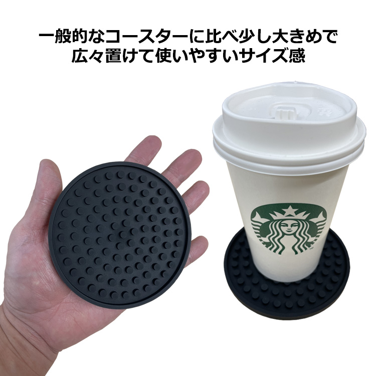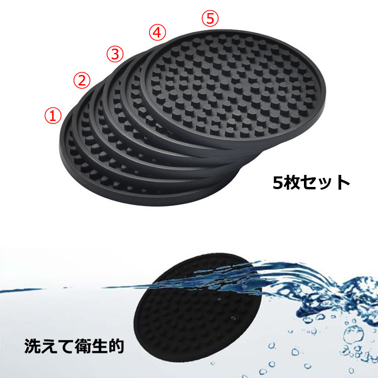 コースター 5枚 セット シンプル ラバー ゴム 滑らない 大きめ 大きい 大判 裏表 丸形 黒 ブラック バーマット風 洗える 丸洗い 衛生的 業務用 送料無料