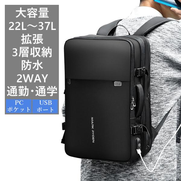 メンズ ビジネス リュック 大容量 37L 最小22L 可変 拡張型 防水 チェストベルト 付属 YKK ジッパー PCリュック 通勤 通学 出張 送料無料