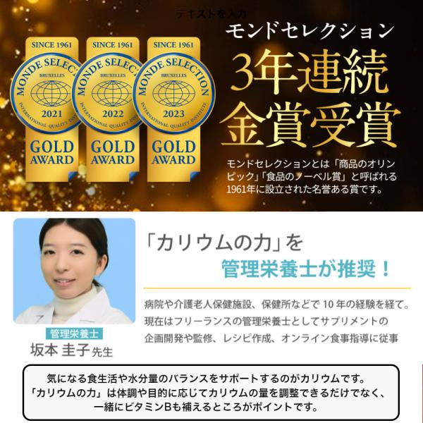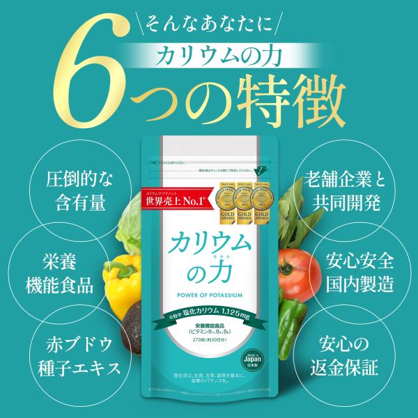 カリウム サプリ 【売上世界No1】 カリウムの力 3年連続モンドセレクション金賞 管理栄養士も推奨 塩化カリウム 1,125mg 栄養機能食品 (ビタミンB) 270粒 日本製