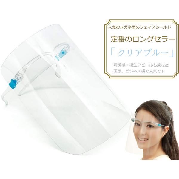 男女兼用可能でブルーのメガネ(眼鏡)タイプのフェイスシールドです。