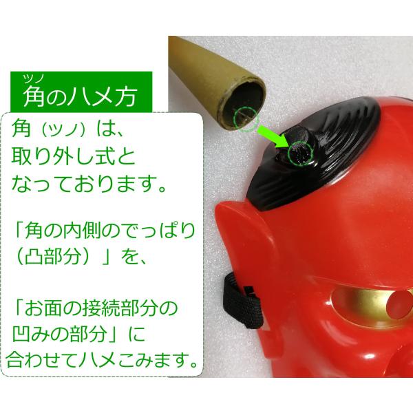 装着時には、ツノの内側の凸部分と、お面の黒いでっぱりの凹部分を合わせるとうまくハメこむことができます。