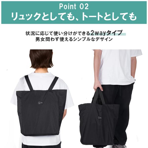 ■たためて、パッと使えるエコ買物リュック。長い物を入れてもリュックの開口部が開きにくい!背負った際に肩ストラップが引っ張られることにより開口部が自然と閉じる「らく閉じ設計」。