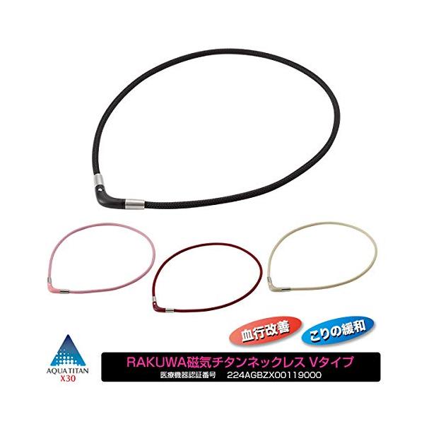 「RAKUWA磁気チタンネックレスVタイプ」は、紐の中芯に着磁した磁気が首・肩に浸透し、血行を改善。固くなった筋肉のコリをほぐします。