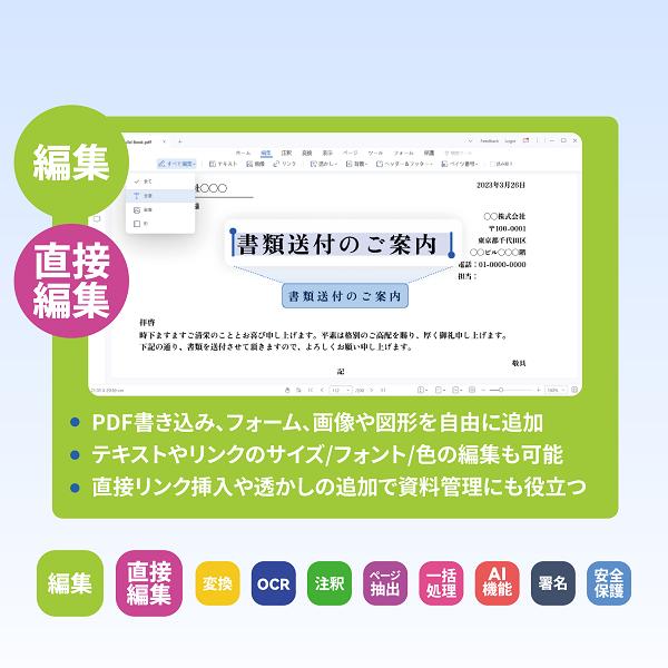 PDFにテキスト、画像、図形、透かしを自由に追加可能です。テキストやリンクのサイズ、色、フォントスタイルの編集も簡単に行えます。