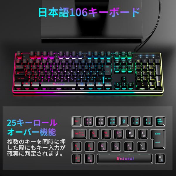 ゲーミングキーボード 有線 106キー日本語配列 25キー防衝突 PC用キーボード RGB1680万色 6種類LED色変え 仕事用/ゲーム用 防水仕様 Windows/Mac OS対応(G038)