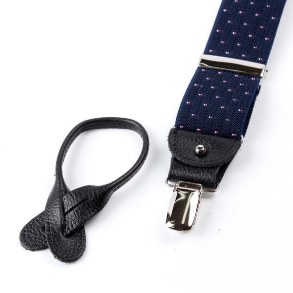 ネイビーにピンドットが入ったデザインです。ボタンが付属されており、お手持ちのパンツに縫い付けて使用することもできます。