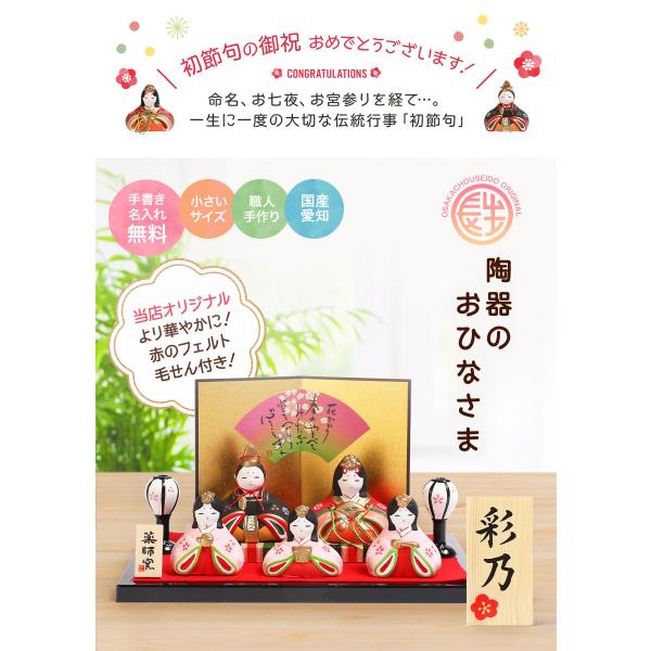 関連ワード:雛人形 ひな人形 お雛様 おひなさま 雛飾り 雛 陶器 コンパクト おしゃれ モダン インテリア 可愛い かわいい 名入れ 木札 ミニチュア ミニ サイズ 小さい 雛祭り ひな祭り ひなまつり 桃の節句 初節句御祝 初節句 女の子 名前旗 命名旗 命名 人気