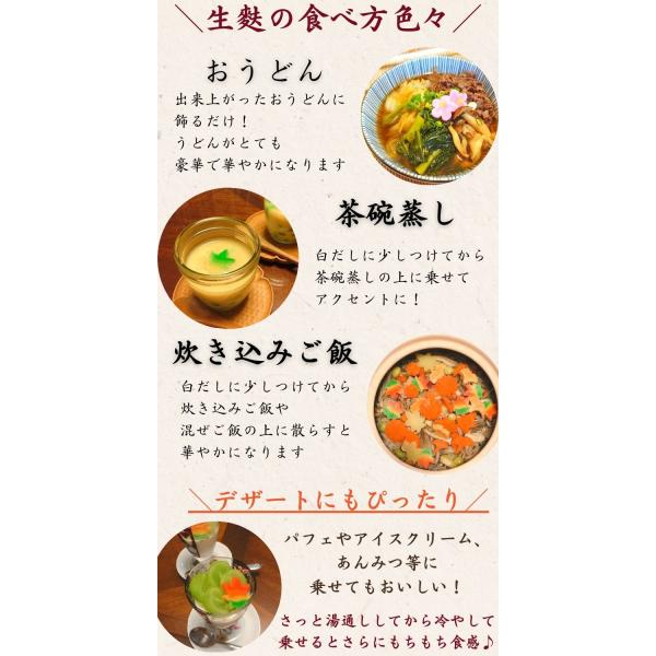お吸い物や茶碗蒸し、煮物等様々な料理に添えると料理に彩りと華やかさを与えてくれます。