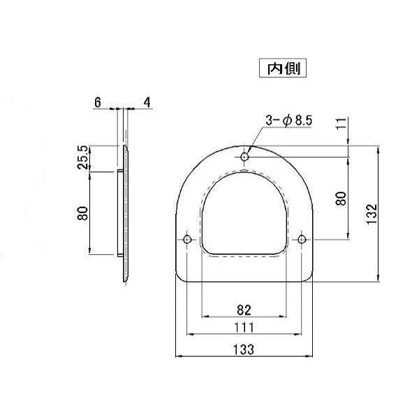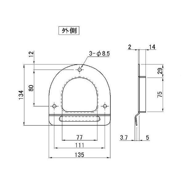 材質//スチール寸法//重量:0.38kg寸法図//画像よりご確認下さい表面処理//三価メッキ仕様//両面セット※平ボディー標準アオリ用のロープ穴通し。2tクラス用、小穴タイプ外板とアオリ合板が貼り合わせタイプのアオリに使用します。
