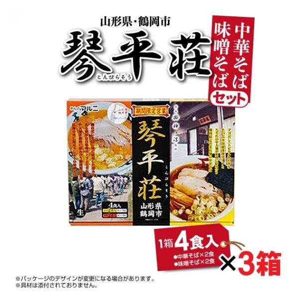 商 品 名 :山形 琴平荘監修 ラーメンセット 計12食 (3箱セット、1箱 4食入り 麺110g×4 醤油スープ45g×2 味噌スープ53g×2)