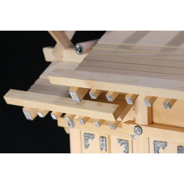 とても落ち着きのあるたたずまい、いぶし銀の神棚です。通常の金色樹脂パーツをすべて銀色で統一しています。社の形式は基本的な三社屋根違い、やや小型の人気サイズ。高級素材である「東濃ひのき」を使用して作成されている点も魅力の一つ。また、お神札を納めやすい、前扉開放型の構造となっています。少し異色の雰囲気を持つお社。