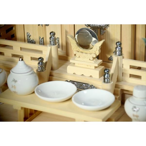 社の形式は基本的な三社屋根違い、やや小型の人気サイズ。神棚本体は高級素材である「東濃ひのき」を使用して作成されている点も魅力の一つです。神具の陶器には「御神前」のあえて金文字入り。金と銀の配色は高級感も漂う、少し異色のセットです。