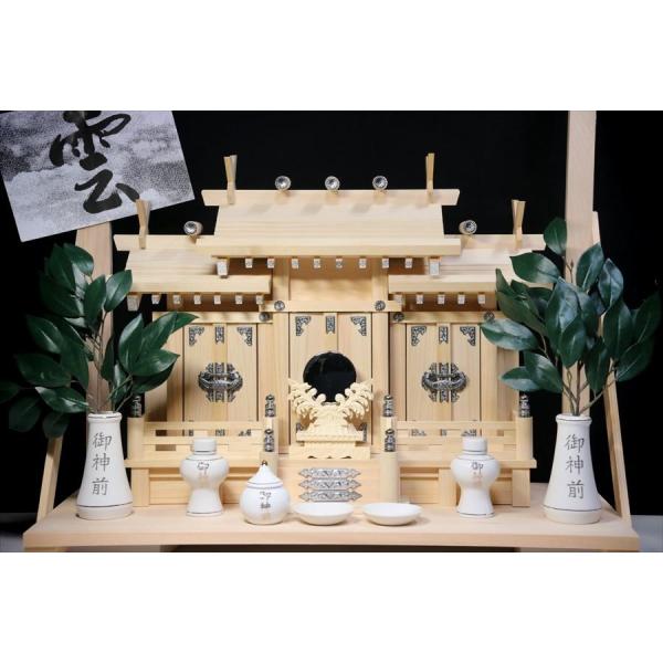 社の形式は基本的な三社屋根違い、やや小型の人気サイズ。神棚本体は高級素材である「東濃ひのき」を使用。神具の陶器には「御神前」のあえて金文字入り。金と銀の配色は高級感も漂う、少し異色のセットです。