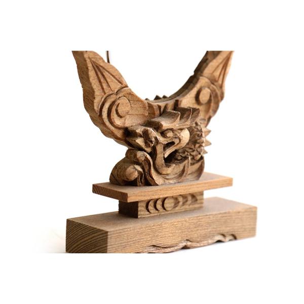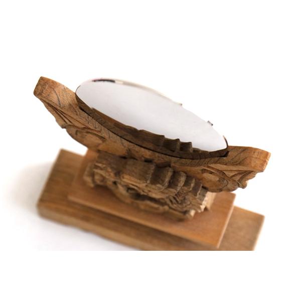 神社の荘厳さを感じる、重みのある神鏡は当店限定商品です。天然の樹脂塗料を使用した、けやき調の神鏡台座は、職人が心を込めて作成。風格のある龍が、お神札や家庭を守護します。