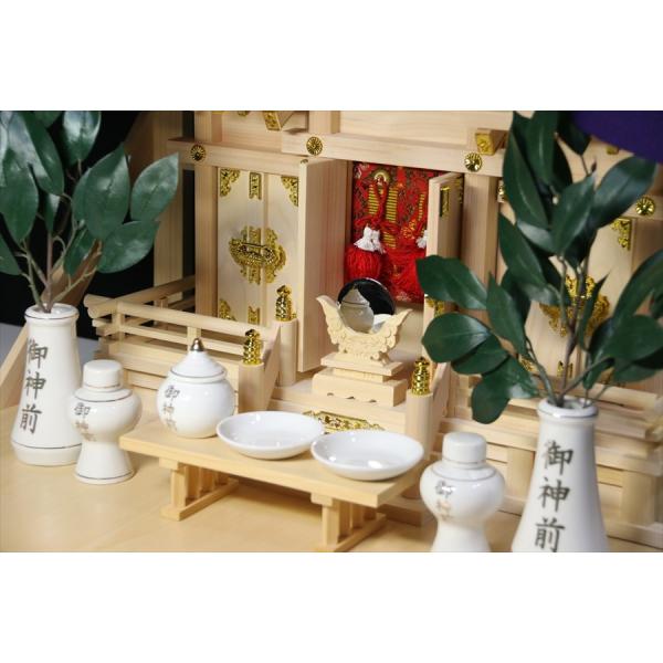 またこの神棚は、中央のお神札を収める部屋に美しいお御簾をしつらえています。神幕の深紫色とのコントラストはとても華やか。「せともの」国産神具陶器、神鏡(金属鏡)も本体に合わせて1ランク上の高級ラインで揃えています。お神札の収め方は前面の扉を取り外すタイプ、大きなお神札にも対応します。 神棚のサイズは最も標準的なサイズとなります。
