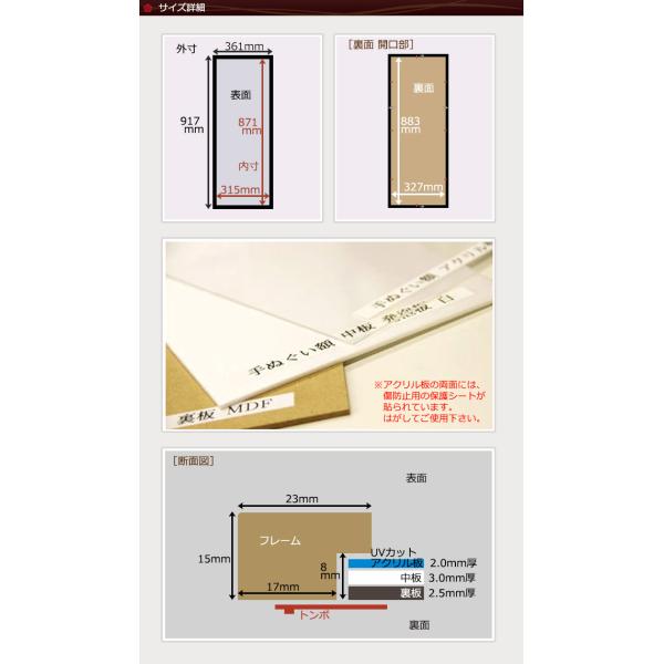 ・前面の保護面には、UVカットアクリル板を採用し大切な手ぬぐいなどを日焼けから守ります。