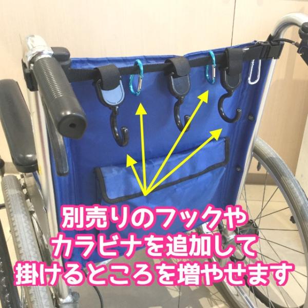 背もたれ中央にS字フックを掛けるのとは違い、車椅子をたたむときに外れません!