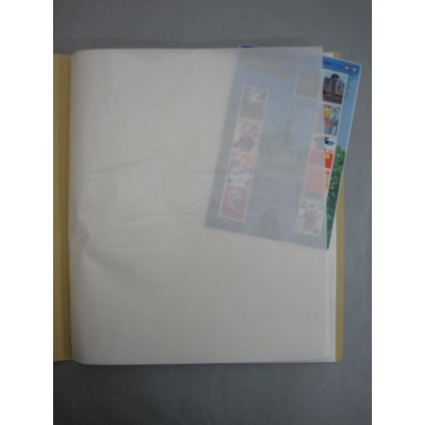 切手シートファイルは、切手シートを折らずにそのまま収納することができます。このファイルはグラシン紙製のL字綴じで、上辺と右辺が開いています。 収納:20枚 寸法:タテ342ミリ ヨコ298ミリ
