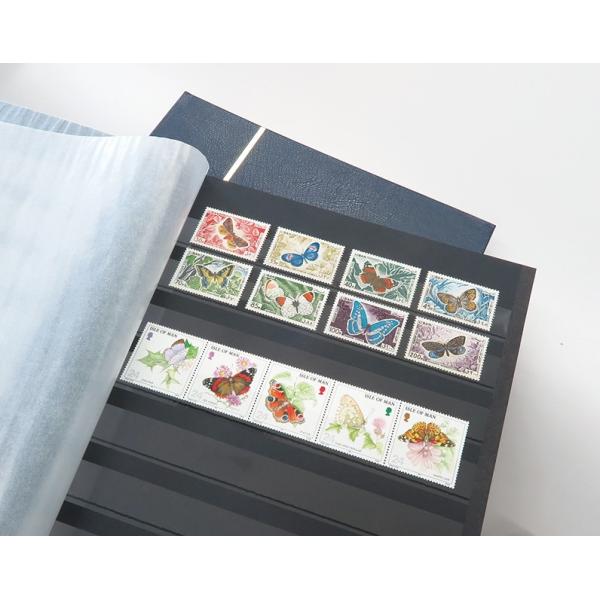 各台紙に透明フィルムのポケットと、切手を守るグラシン紙の間紙がついています。表紙は黒・青・赤より選択してご注文ください。 台紙:16枚32面(各面9段ポケット)寸法:横幅230ミリ・縦幅307ミリ